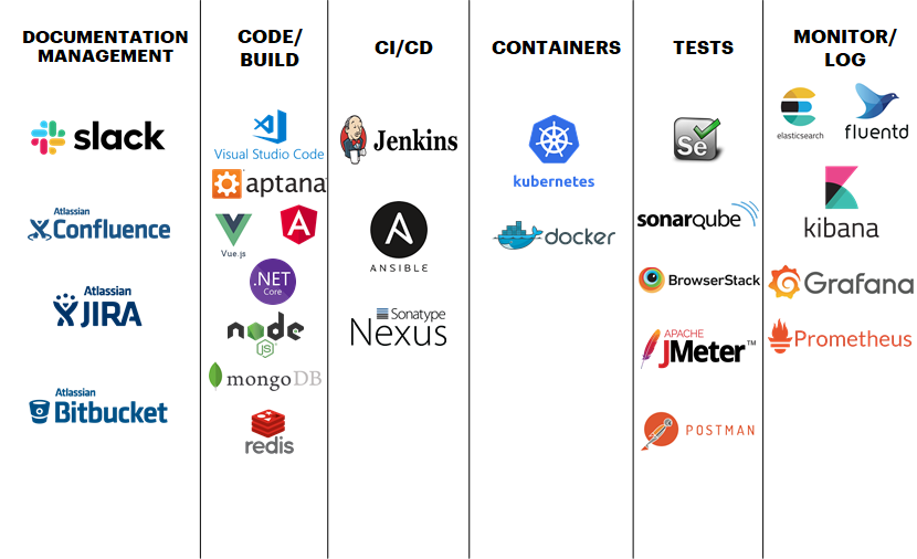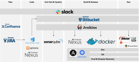 - Slack – uma ferramenta (talvez até uma plataforma) de comunicação parecida com WhatsApp, porém com mais possibilidades, sendo permitido conectar a ela produtos como repositórios Git, Jenkins, Google Drive entre outros, é uma ferramenta para ter as comunições do time além das comunicações de deploys, merges e até mesmo alertas de produção.