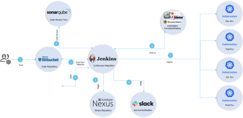 - O Jenkins faz a orquestração entre todos os sistemas após o commit/push no repositório