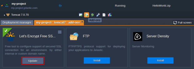Se necessário, o add-on Let’s Encrypt SSL pode ser facilmente removido do ambiente. Para fazer isso, navegue até a guia Add-ons clicando no botão com o mesmo nome ao lado do node de cálculo (balanceador de carga) no ambiente correspondente: