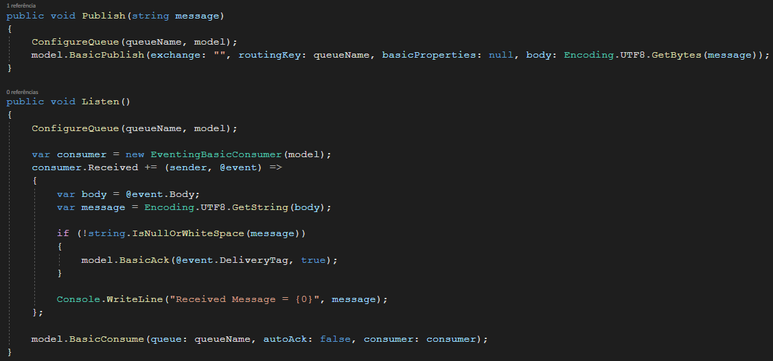 º Listen() — Responsável por ler as mensagens da fila do RabbitMQ. Caso a mensagem esteja vazia, não será executado o comando ACK, responsável por confirmar que a mensagem foi entregue, dessa forma a mensagem irá continuar na fila.