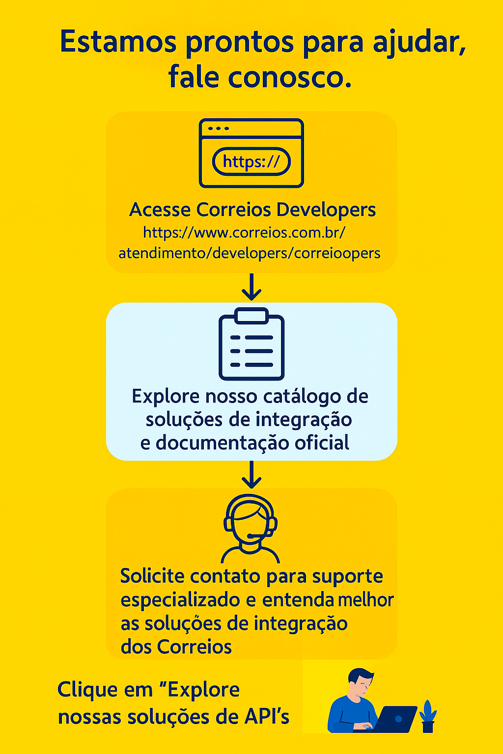 Além da página principal do Correios Developers, a estatal também abriu um endereço complementar (c.correios.com.br/soluções de API’s) para atendimento específico. Cada solicitação é analisada individualmente e direcionada ao setor adequado, garantindo respostas alinhadas ao contexto de cada integração — desde dúvidas simples até demandas mais complexas de arquitetura.
