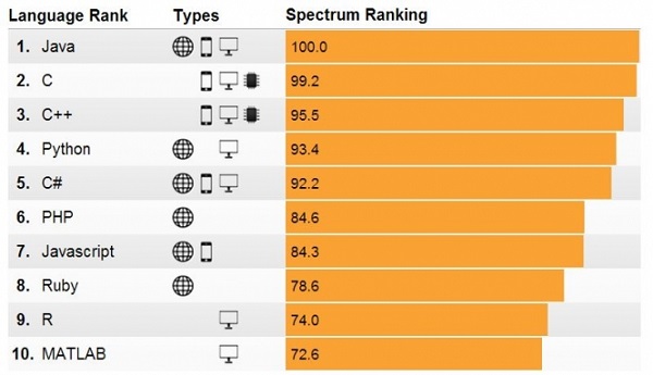 O mais recente ranking da IEEE trouxe o Java como a linguagem de programação mais popular do mundo, à frente de C, C++, Python e tantas outras. O ranking classifica as linguagens tendo como base doze fontes de dados diferentes, que vão do Google e do GitHub ao Stack Overflow e ao fórum Hacker News.