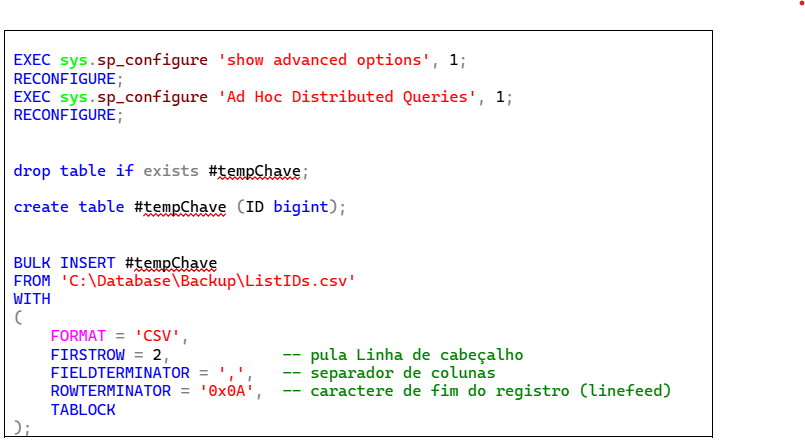 Esta operação tem como pré-requisito a configuração de dois parâmetros globais de operação do servidor SQL, que são executados no início da operação. Em seguida criei uma tabela temporária, já que este procedimento será executado apenas uma vez. Finalmente, carreguei os dados do arquivo CSV para a tabela temporária, como se vê a seguir.