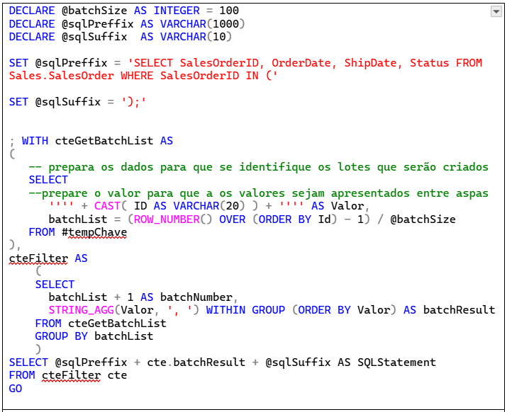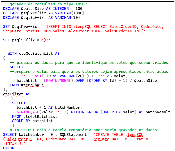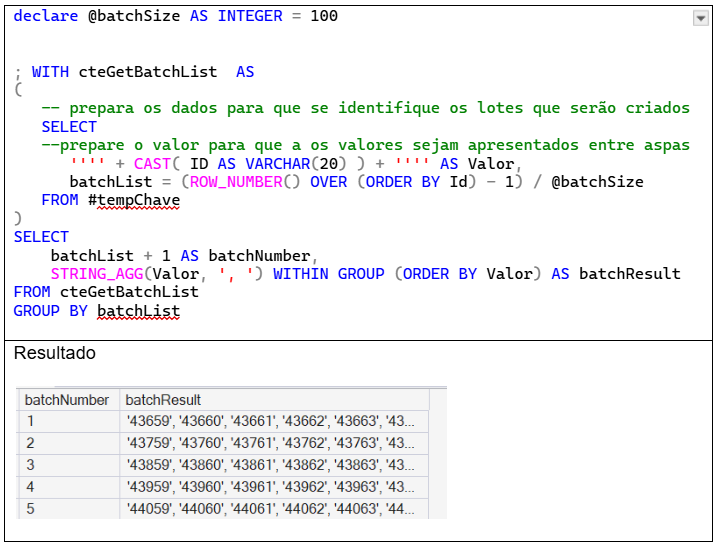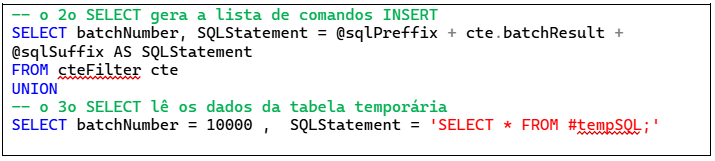 Na sequência do script, transformei o segundo SELECT numa segunda CTE e, finalmente, adicionei outro SELECT para construir a declaração que será executada em cada lote.