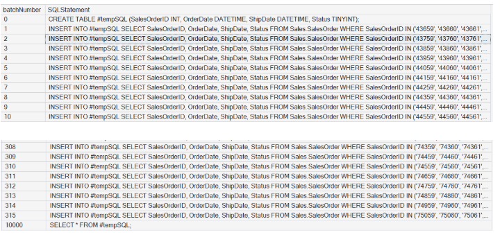 Para gerar a lista de chaves consideradas em cada uma das consultas, a primeira preocupação é identificar a qual “lote” pertence a chave que está sendo tratada. Eu usei a cláusula OVER() e função ROW_NUMBER() para tratar este caso.